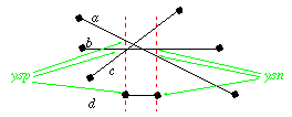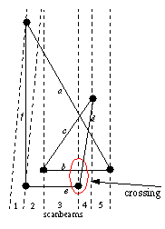 The intersections are found using scanbeam algorithms ( See Scanbeams. ). Snapping nodes to lines and nodes to nodes is an integrated part of this. The whole procedure to calculate intersections looks to much complicated. But this is all due to the integrated snapping feature, which is essential to reach a stable algorithm that can be used for extremely complicated drawings. Snapping a node to a link is done by looking at the distance in vertical and horizontal direction, because this can be done quickly. The effect is that in reality we check if the node is within 1/sqrt(MARGE) distance to the link, this is acceptable. intersecting links steps. gives an example of the steps involved