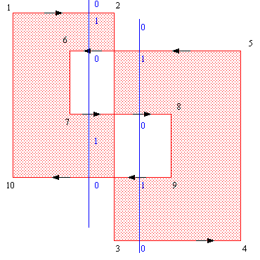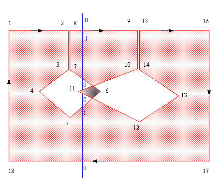 A common method to makes holes part of a polygon, is to connect the hole to the outside with to extra segments. Based on the filling method the holes can be displayed as being empty. A strange situation arises when two such holes start overlapping each other (see figure 7). All above described filling methods will give the same result. The overlapping part of the two holes is filled. This behaviour can best be explained if we decide that the polygon is a 2D projection of twisted paper.