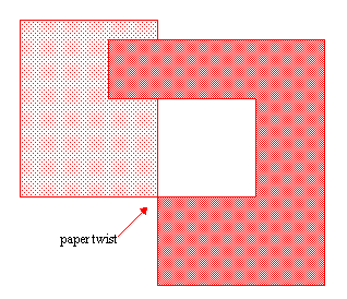 Also the material can be folded and twisted. If we paste such a folded/twisted piece of material on a 2D surface (projection on 2D), we could end up with a polygon like in C and D. In that case the filling in D would be preferred, and this filling can not be achived with winding rule or alternate filling. In figure 6 the twist in the paper is shown, after the twist the back of the material which had a different color, becomes visible, before the twist the front was visible.